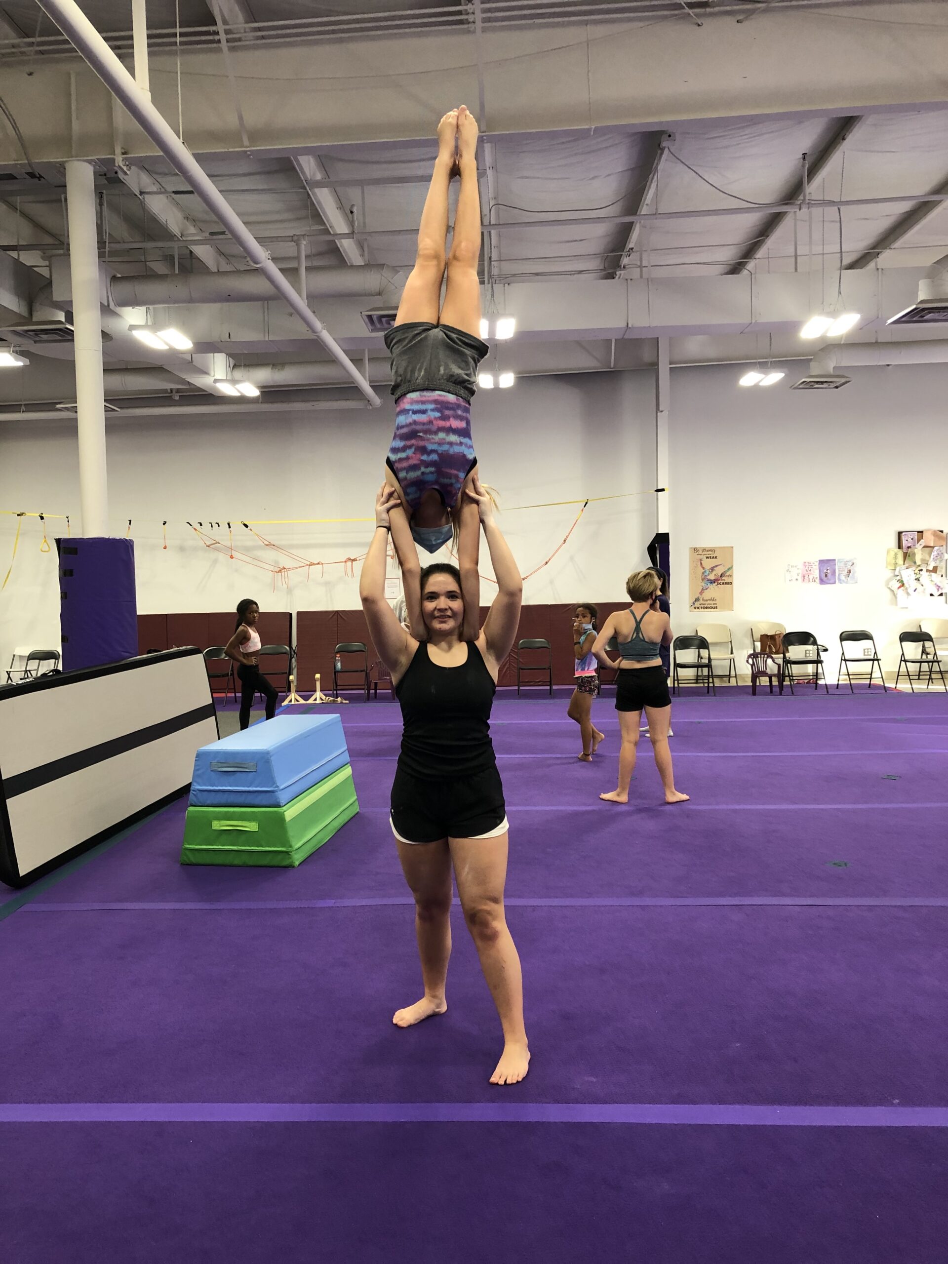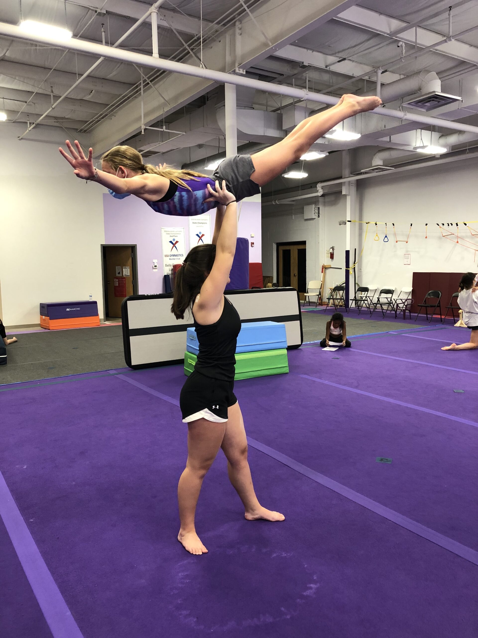 Ella Davis (Top) is 11 years old and in the 5th grade from Mechanicsville, Virginia. She started Acrobatic gymnastics in 2019. She has been in 2 different partnerships. Her favorite food is steak, her pets are named Jack and Blue, and she has two sisters- Megan and Grace.