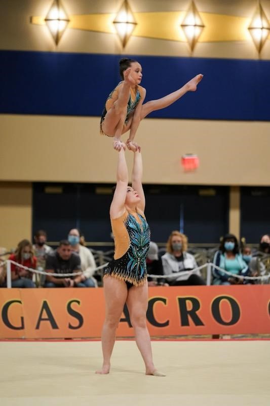 Hanna Hanulik (Base) is 18 years old and a Senior in high school from Newark, Delaware. She started Acrobatic gymnastics in 2019. She I most looking forward to competing in her first Nationals. Her favorite skill is Cannon Ball. Hanna’s favorite TV show is Outer Banks.